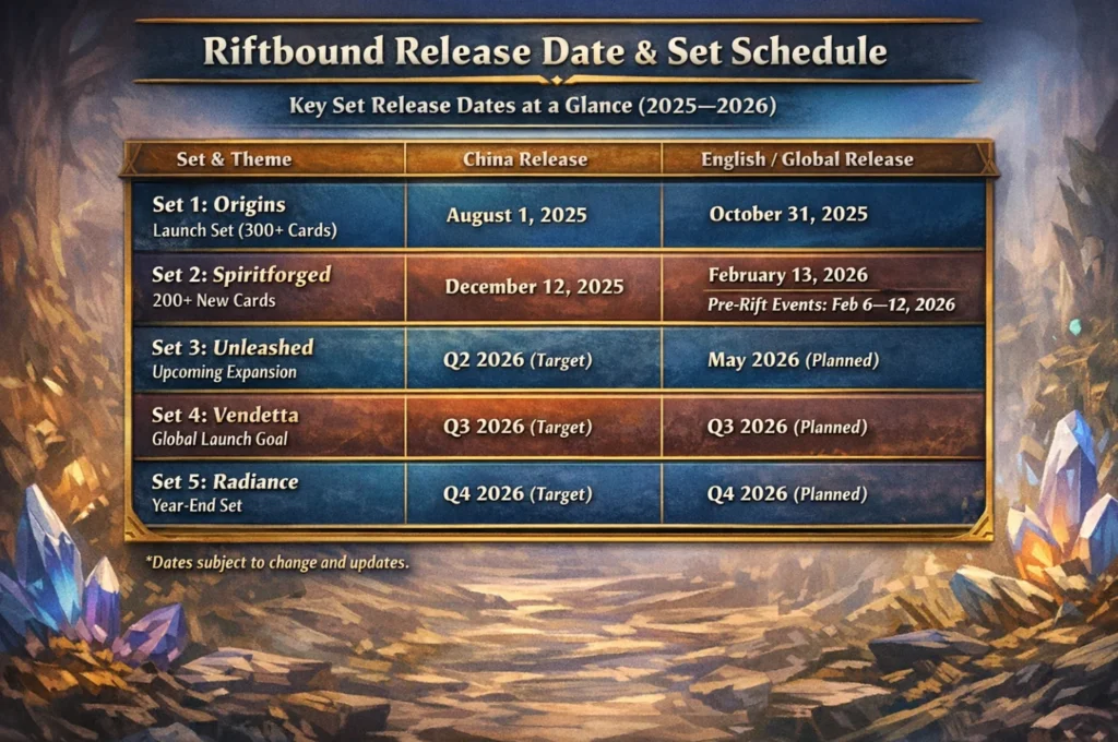 Riftbound started with a China-first launch and then moved into English and other languages. From 2025–2026, sets are built around a quarterly release cadence, with Riot working toward near-global parity by late 2026. If you just want the key Riftbound release dates for each set, start with this table.